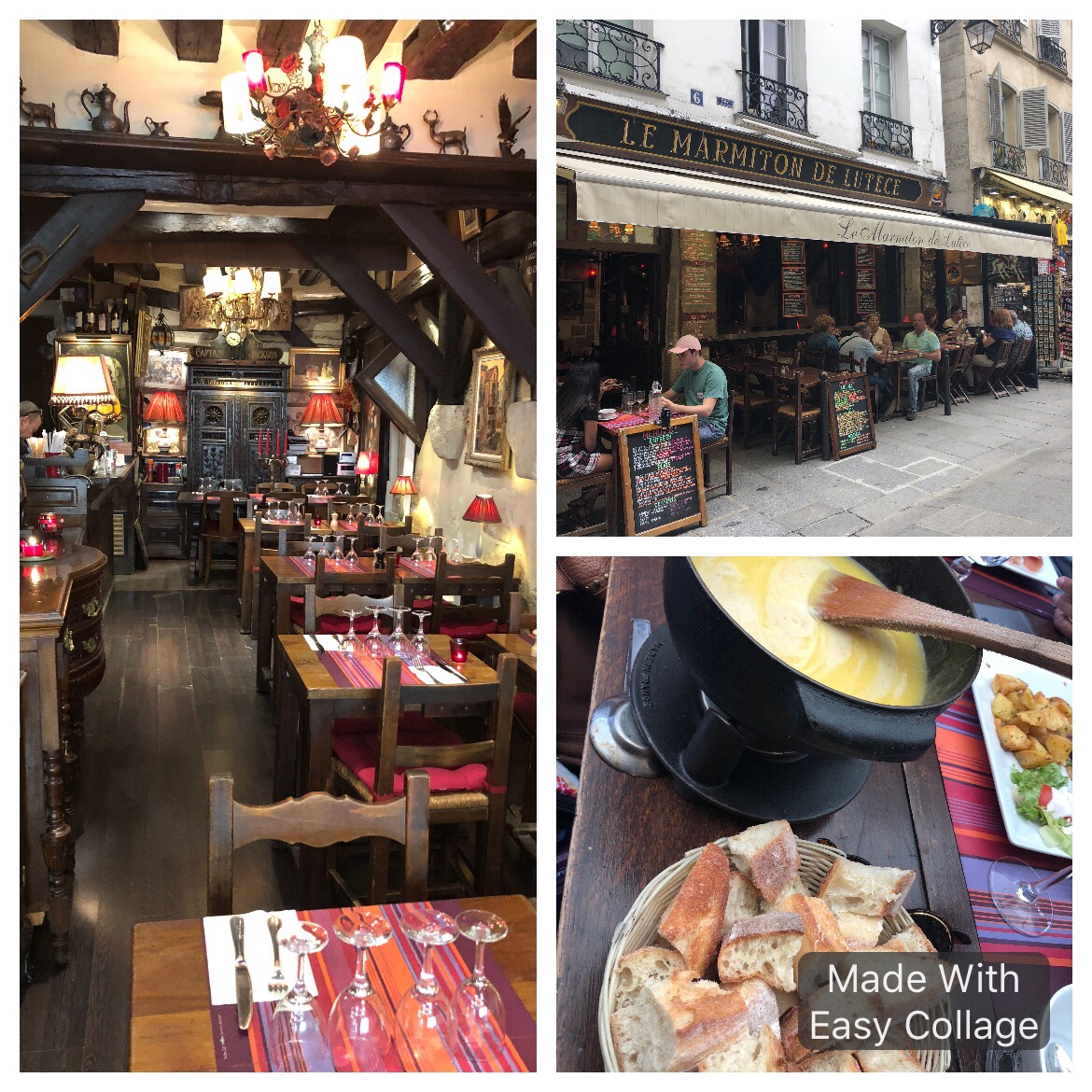 We had lunch in a wonderful cafe- Le Marmiton de Lutece. I had a three-cheese fondue that absolutely melted in my mouth! We sat outside and enjoyed the people watching and the atmosphere. I snapped a photo of the inside when I went to use the toilets (never called bathrooms or rest rooms).