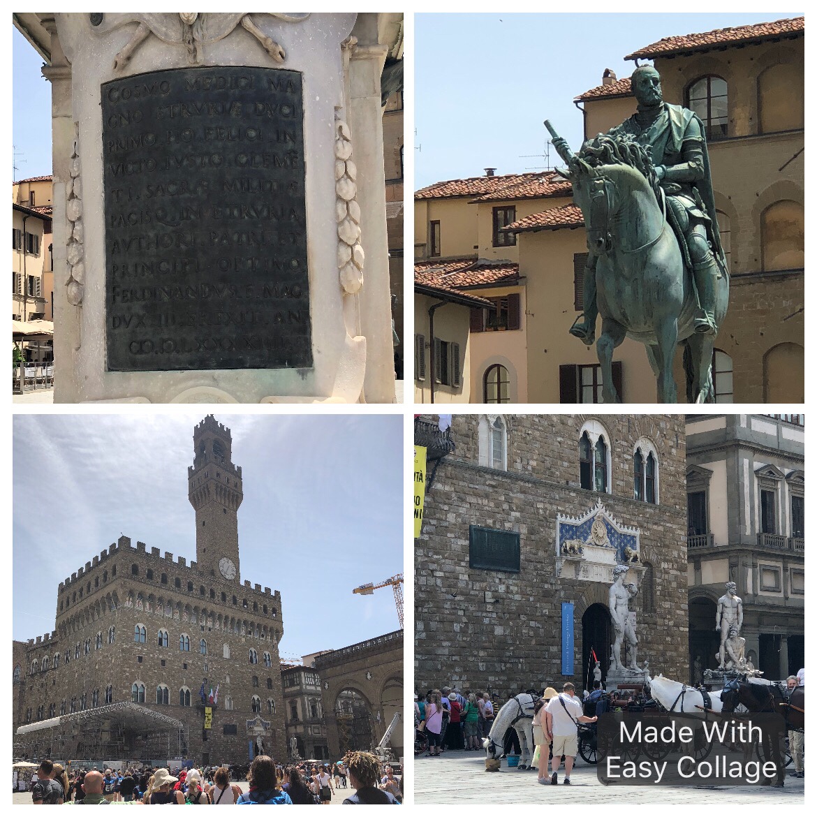 I woke up and we were nearing the station in Firenze. Our luggage was picked up by a local company, and my pal Stephanie was dubbed the one who would go with the luggage carrier to make the drop off and meet us back. We put her location in our “WhatsApp” so we could track her and hit the ground- headed for our first stop which was at the Piazza Della Signoria. This square became a central meeting place for our time in Firenze. In the center of the square stands a giant statue of Cosimo de Medici- a statue of power that reminds everyone of the most powerful family in Florence history.