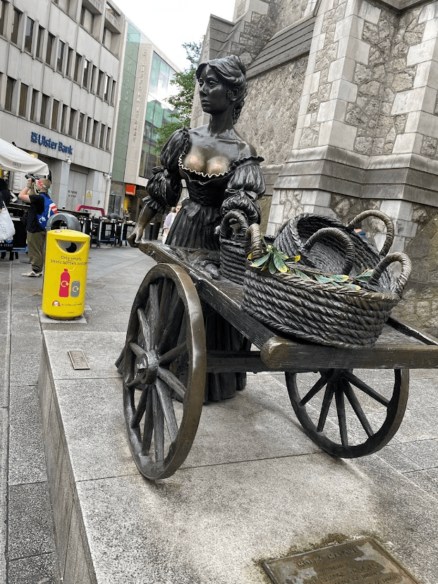 She is known, by locals, as the “tart with the cart”. She is the subject of the Irish Folksong “cockles and Mussels”: “In Dublin’s fair city/ Where girls are so pretty/ I first set my eyes on sweet Molly Malone./ As she wheeled her wheel-barrow/ Through streets broad and narrow/ Crying “Cockles & Mussels”, alive, alive, oh!”