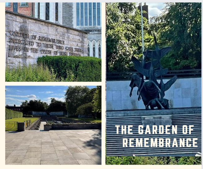 I really enjoyed the sites of Dublin. A few other spots we visited, which are worth mentioning, were Dublin Castle (see photo in final collage) and the Garden of Remembrance. This Garden, located in Parnell Square, is a memorial put up in 1966 to honor those who fought for Irish freedom. At the far end of the pool is the “Children of Lir” sculpture, which shows children turning into swans. Legend has it that an evil stepmother put a curse on the children and turned them into swans. They had to stay in their swan bodies for 900 years. In the myth, they finally become humans again but they are old and near their death. This represents the fighting Irish. In essence, the statue symbolizes rebirth and resurrection not only of the children, but of the Irish People as well.