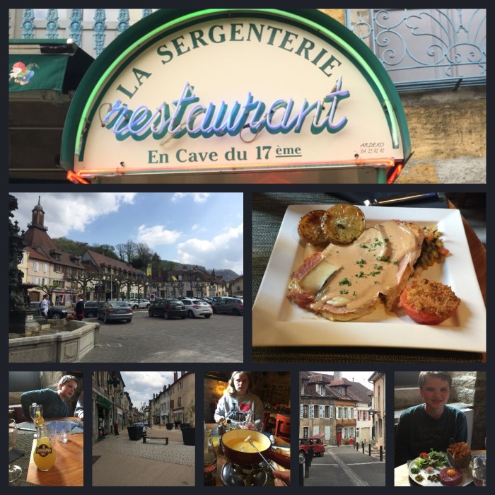 We stopped for a fabulous lunch in a town called Poligny. We ate in a wonderful historic restaurant, called La Sergenterie, which is built into a cave! We enjoyed dinner, and Noah, not to be outdone by his old man, ordered and finished his steak tartar. I enjoyed my first of three days of cheese fondue! After what proved to be our “big meal” for the day, we continued our journey to Zermatt, Switzerland.