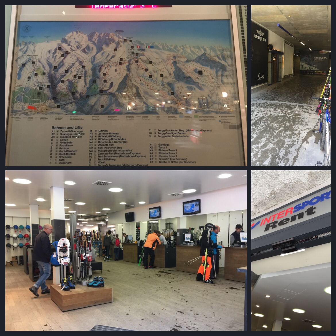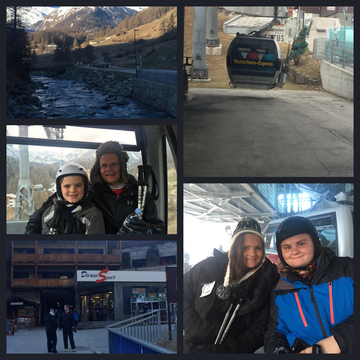 We awoke the next morning eager to hit the slopes! We opted for a shop next to the gondola, “Intersport Rent”and were impressed with the friendliness of the staff. With gear ready, and lift tickets in our pockets (the left tickets were magnetic cards that let you through the lifts by scanning them through your jacket pockets), we loaded into the “Matterhorn Express” gondola and rode up the mountain.