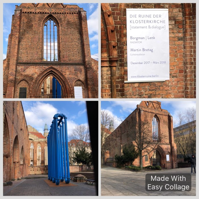 We found our way across a very busy street and wandered around the Franziskaner-Klosterkirche Ruins. This was once a church, built in 1250, that was destroyed in the bombing of Berlin in 1945. There were giant blue pipes built inside that seemed to serve no purpose, so I’m guessing it was some sort of modern art. I felt like it really took away from the beauty of the ruins, if I’m being honest. It was, modern art aside, a good visual of the destruction that truly flattened the city… and what remained.