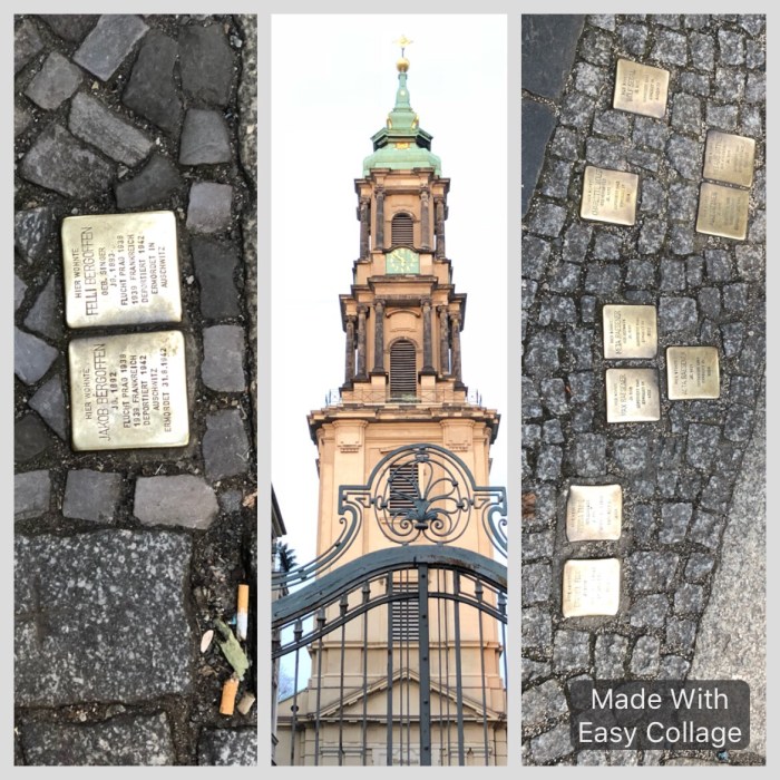 We stopped to look at the ground outside the church and saw many “Stolperstein” (translates to stumbling) stones. These are stones that are mini monuments, with brass plates on each one that name the victim and the dates of their lives. Hitler murdered these people, and the modern Germans want visitors to honor them and never forget these innocent human beings.