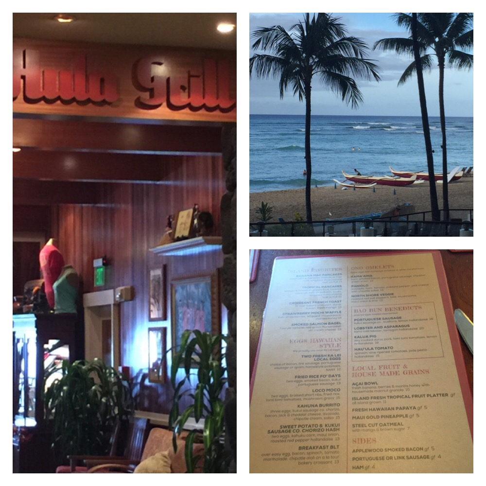 Since we were caught up in the time-change funk, we rose at around 4:30am. After the ultimate parking challenge, we went for Saturday breakfast at the Hula Grill, a chain popular throughout the Hawaiian Islands. The view was fantastic, and the breakfast fare was all Hawaiian- and delicious! I ordered eggs Benedict with Hau’ula tomatoes and spinach on a toasted bao bun, and fresh papaya & pineapple. This was a far cry from my normal nutri grain bar! Delicious.