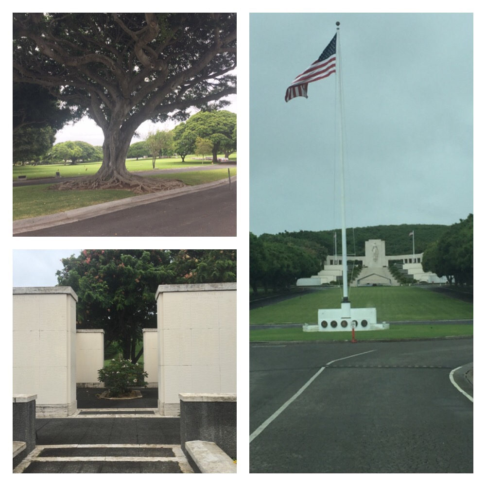 After making our way back down, we drove to the National Memorial Cemetery of the Pacific, also known as the Punchbowl Cemetery, because the site sits in the crater of surrounding volcanoes. In Hawaiian, the term “punchbowl” is “Puowaina” which means “Hill of Sacrifice”. This is a befitting name for this beautiful, solemn resting place of over 13,000 soldiers and sailors who died in WWII. There are also 70 generic “unknown” markers for the graves of soldiers who died at Pearl Harbor.