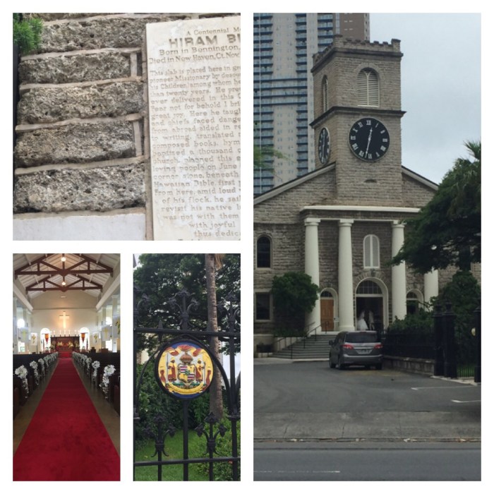 Down the street from the palace sits Kawaiahao Church, which is the first Christian church built on Oahu in 1842. The church is sometimes referred to as the “Westminster Abbey of the Pacific”. The coolest part of the church is that it was built by missionaries using 14,000 pounds of coral slabs from ocean reefs. There was a bride and groom getting photos taken when we arrived. The groom looked about 65 and the bride in her twenties. We thought it might be a father daughter until they kissed. Nope. Definitely a couple!