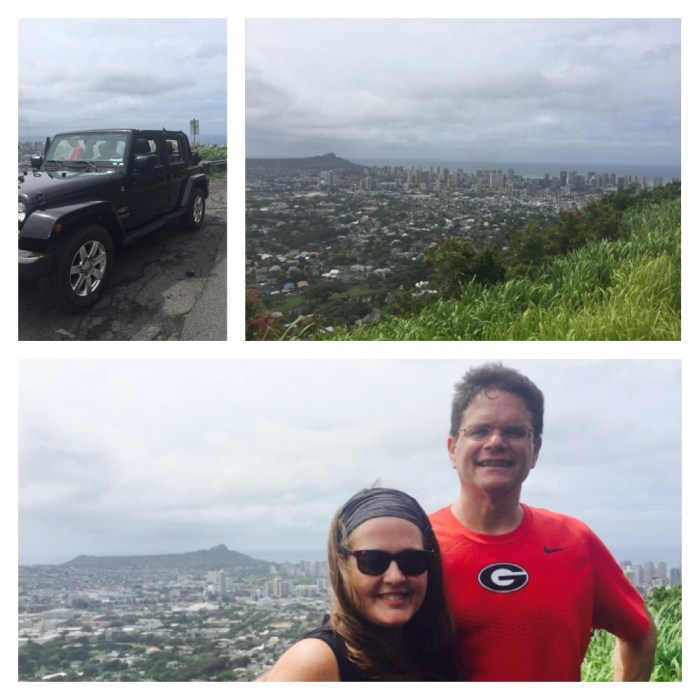 Once I picked up the Diamond Point hikers, we headed to Tantalus Road to make the Round Top drive. We took the top off the jeep for the ride- not the least bit easy- and set out on the steep, curvy jaunt to the top. We stopped at a beautiful lookout spot to take in the views on the way up. We had a great view of Diamond Head, the Punchbowl Crater, and downtown Honolulu. We continued up, and the open jeep was amazing… until the rains came! Without any more pull offs, and crazy, cliff- hanging cottages lining one side, all we could do was embrace the rain until we got to the top!