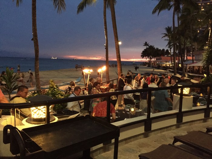 After the ceremony, Jim’s CEO put the Crawford & Company people on a shuttle to Duke’s Restaurant, where we were escorted out past the pool to a private dining area directly on the Pacific. Tiki torches lined the walls, and a gorgeous Laie was placed around each of our necks. We had cheeses and shrimp appetizers, all the Mai Tais we could drink, and a beautiful buffet of Hawaiian fare including fresh caught Mahimahi. And to think… this was just our first full day… more adventure awaits!